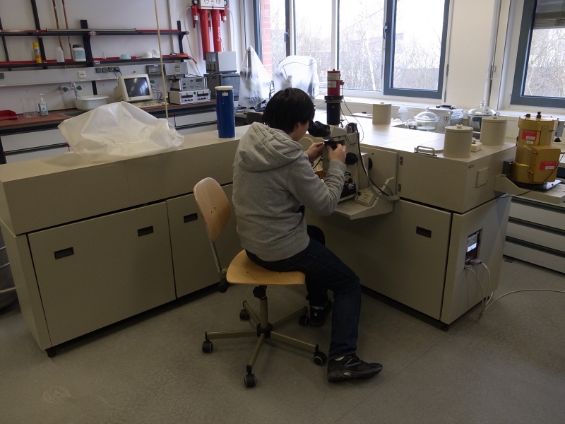表面を研磨するために実体鏡をのぞくと、